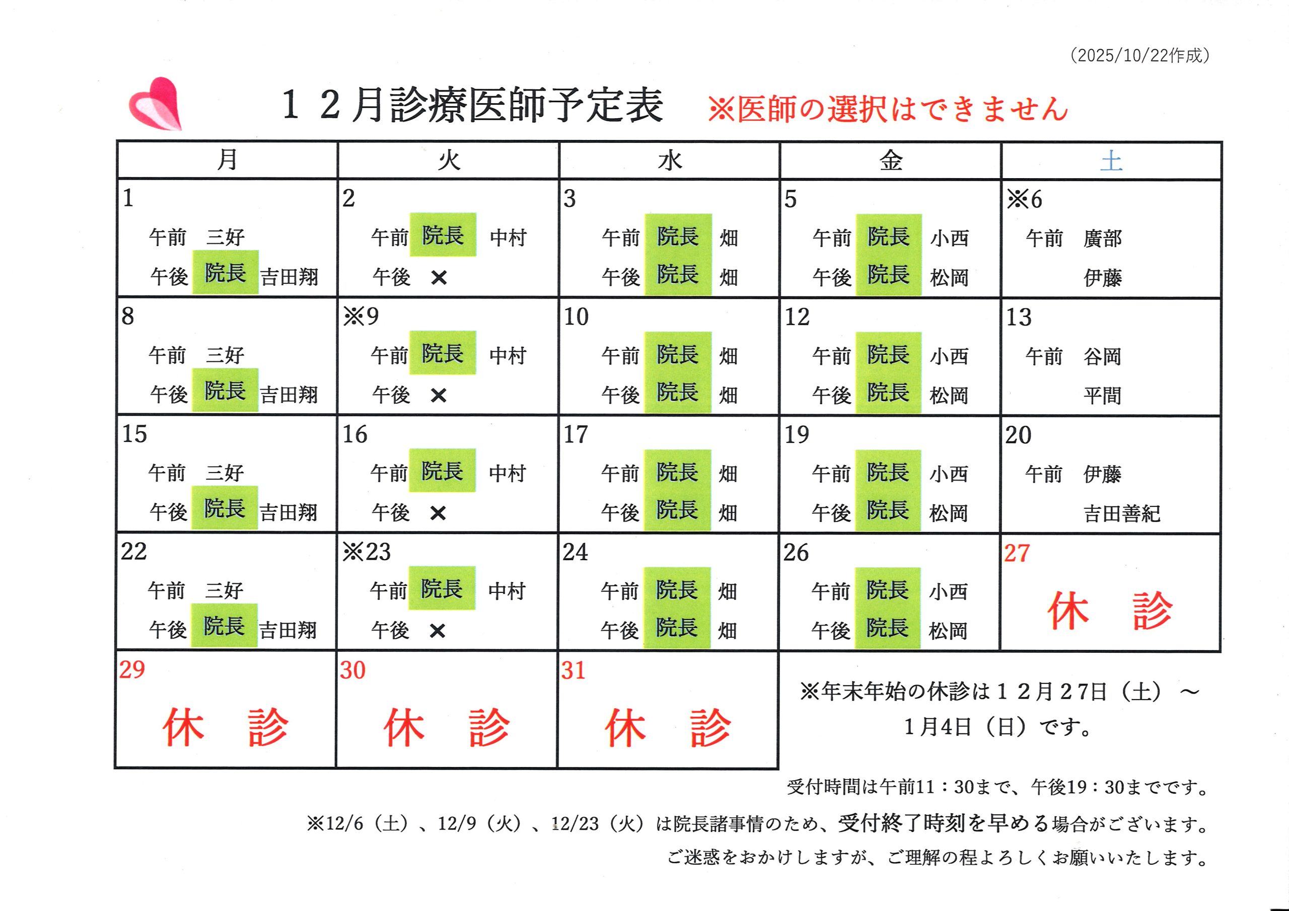 ※11/4(火)、11/7(金)、11/25(火)は院長諸事情のため、受付終了時刻を早める場合がございます。