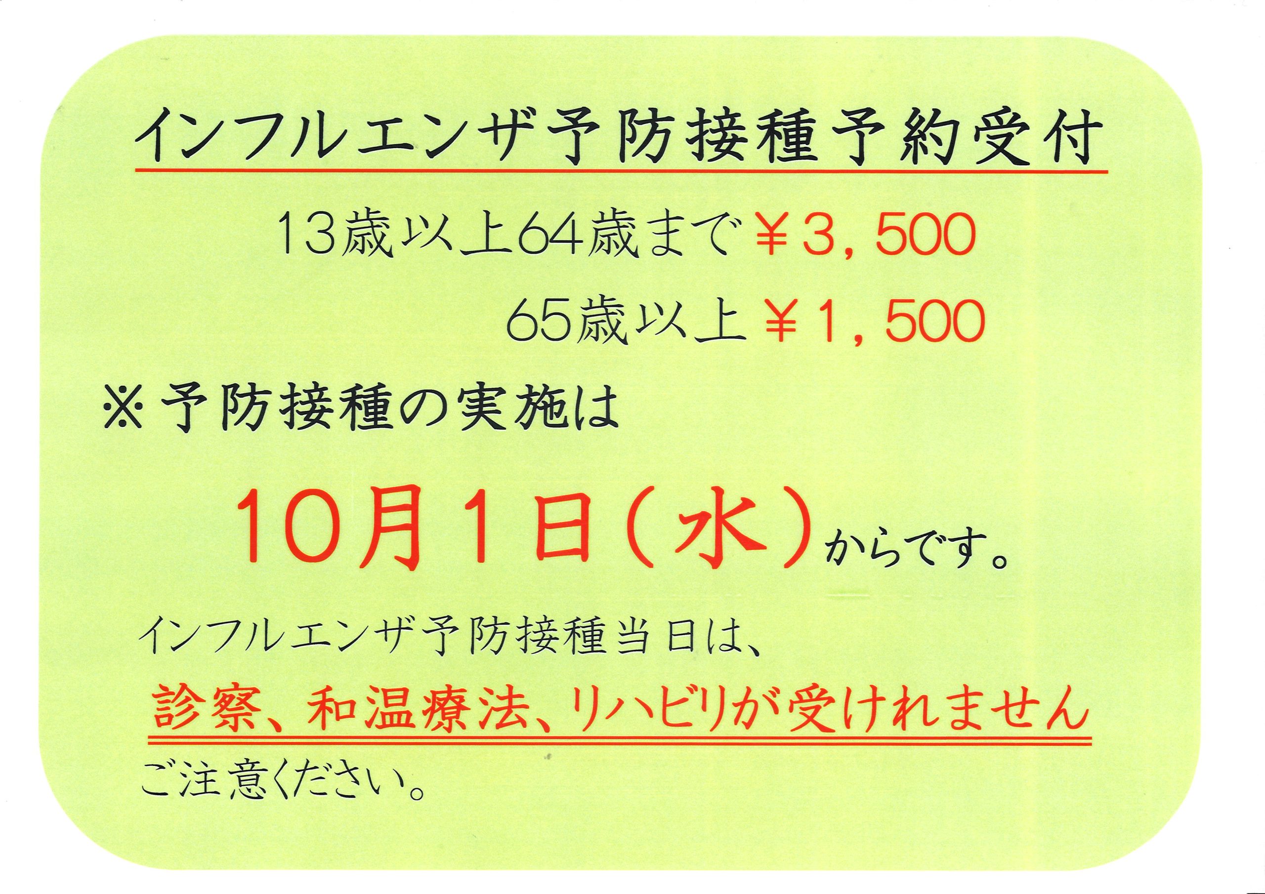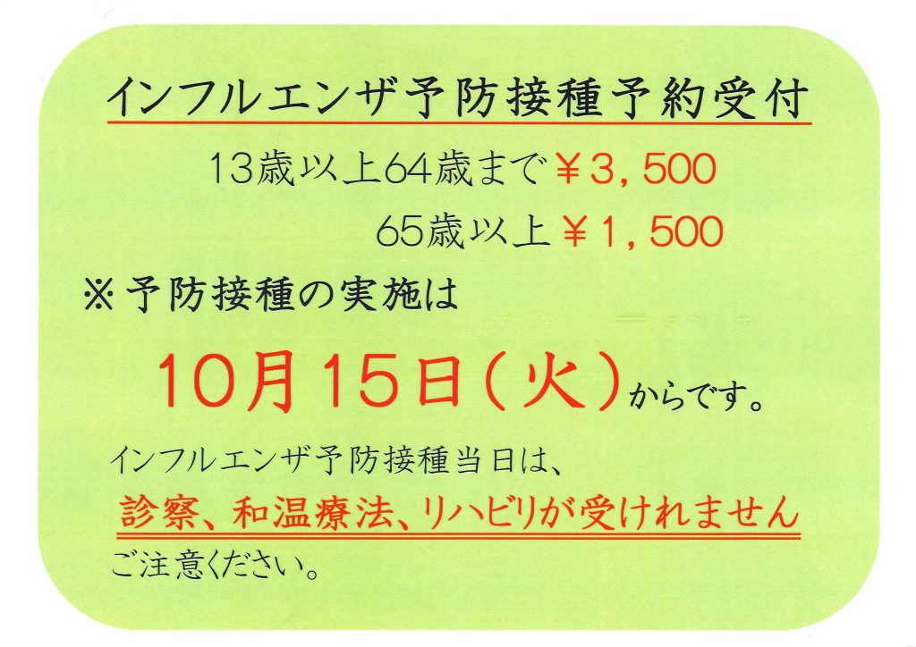2024年度インフルエンザ予防接種予約受付開始いたしました。